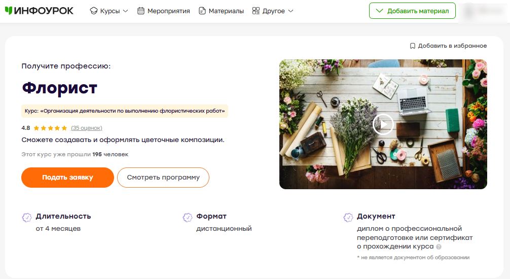 [Инфоурок] Получите профессию: Флорист. Курс профессиональной переподготовки «Организация деятельности по выполнению флористических работ»